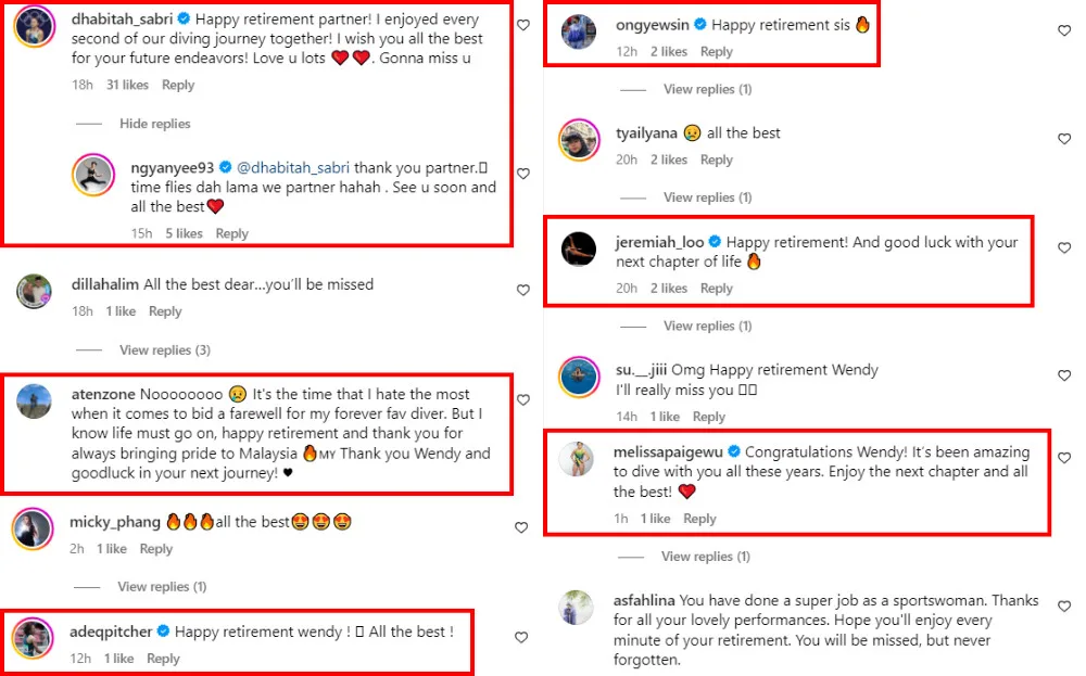 Many fans and fellow athletes shared their reaction to Wendy’s news, wishing her a happy retirement. Her diving patner Nur Dhabitah also sent her well wishes, saying, “Happy retirement partner! I enjoyed every second of our diving journey together! I wish you all the best for your future endeavours!”.