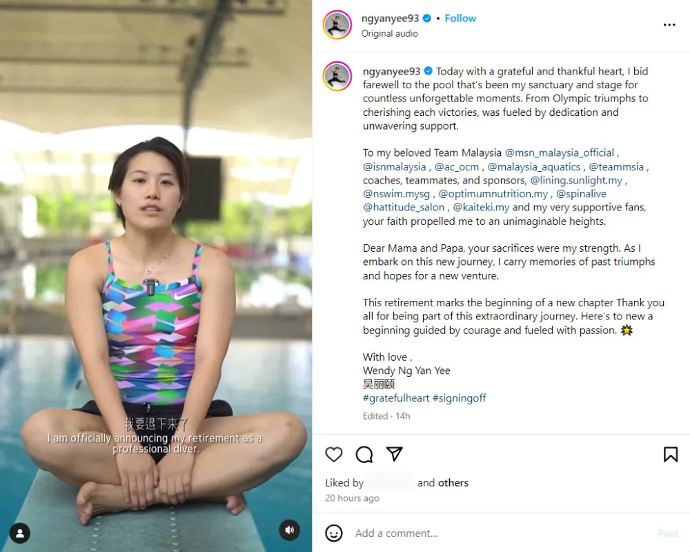 In her announcement post, Wendy wrote, “Today with a grateful and thankful heart, I bid farewell to the pool that’s been my sanctuary and stage for countless unforgettable moments.” The diver also took the opportunity to thank the National Sports Council, various sporting bodies, her coaches and teammates. She also expressed gratitude towards her sponsors, fans and family for their support throughout her career.