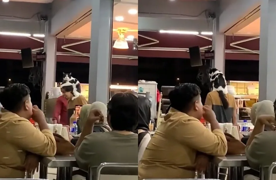 The man can be seen ordering something from the servers before slowly walking out of the premise. The unusual sight caught the attention of every customer in the restaurant as they were all gazing at him; some even whipped out their mobile phones to snap photos and videos of the man with his pet. The feline companion behaved very well in the public space as it held on to its owner’s head the entire time.