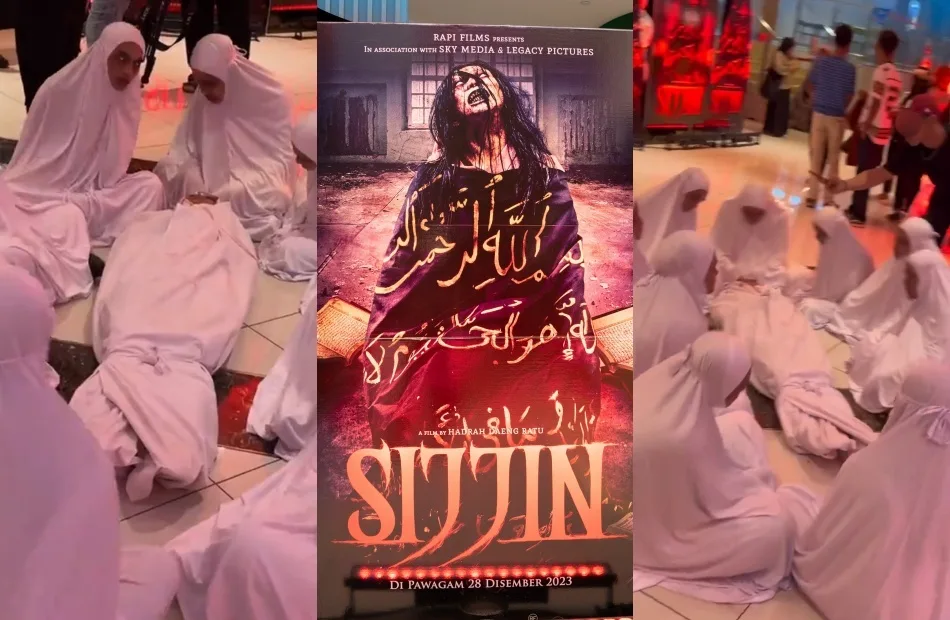Yesterday (Thursday, 21st December) was the premiere screening of an Indonesian horror movie titled “Sijjin”, a film about a young woman who uses black magic to threaten her cousin’s wife. To commemorate the special occasion, a group of scare actors in white telekung performed a “dark magic ritual” around a “dead body” at a Golden Screen Cinemas outlet in Tropicana Garden Mall.