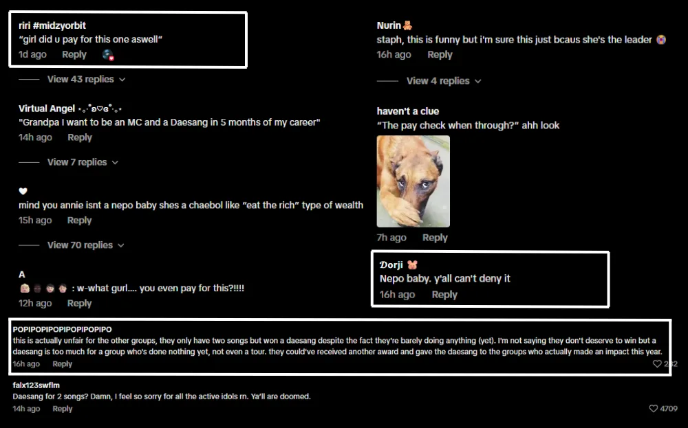Much of the backlash centres around member Annie (애니), whose family lineage has been thrust into the spotlight. As the great-granddaughter of the founder of Samsung Group, the idol is a fourth-generation chaebol heir, and critics argue that the group’s win may have been influenced by her family background. Despite the group’s popularity and strong debut numbers, many netizens insist that the award was “undeserved” and “purchased”.