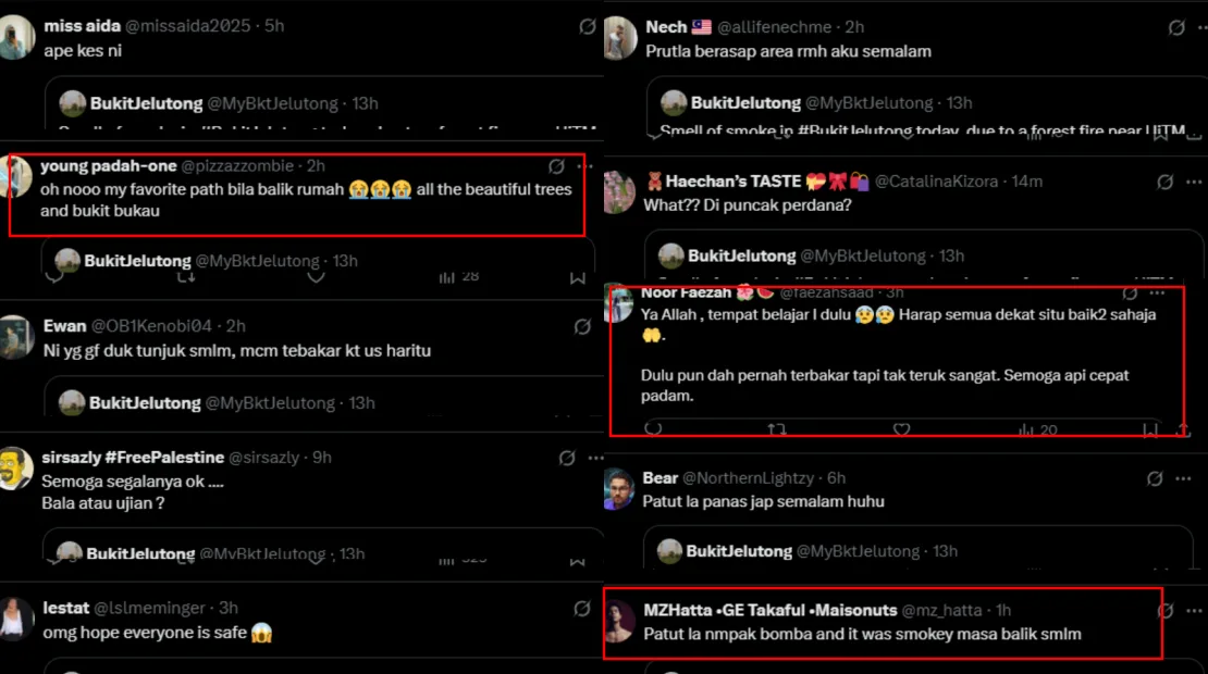 Those who were driving along the road near the forest captured the terrifying scene, sharing photos and videos online. Some pointed out that it was rare for a forest fire to occur in the area, while others expressed hope that no one had been injured and voiced concern for the wildlife. Residence in Bukit Jelutong also shared how they could smell the smoke and felt the heat coming from the forest fire.