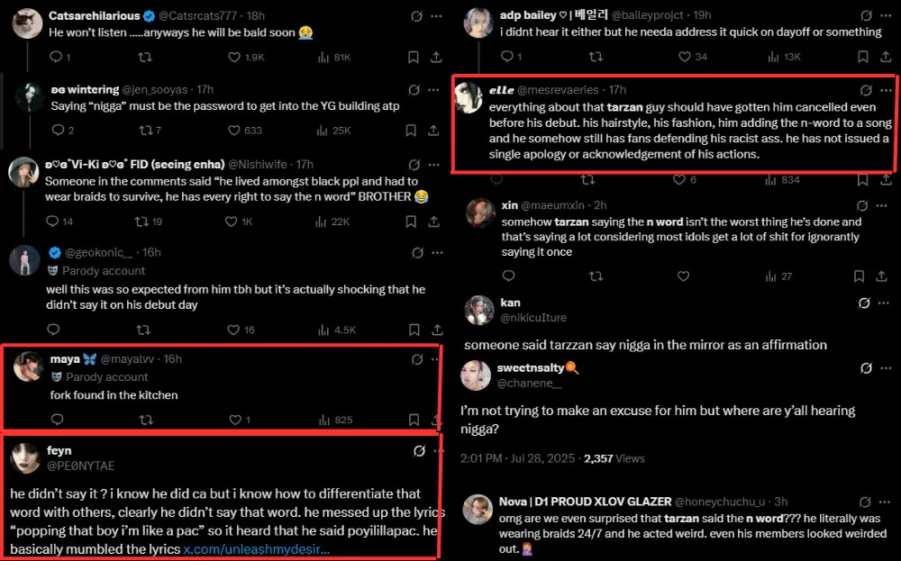 Twitter user @/mesrevaries comments, “Everything about that Tarzzan guy should have gotten him cancelled even before his debut”, “He has not issued a single apology or acknowledgement of his actions”. Netizens also called out that this isn’t his only case of cultural appropriation, as his wardrobe and style have also contributed to the issue. However, a handful of netizens have come out to defend the idol, with Twitter user @/PE0NYTAE commenting, “He messed up the lyrics ‘popping that boy I’m like a pac’ so it sounds like ‘poyilillapac’. He basically mumbled the lyrics”.
