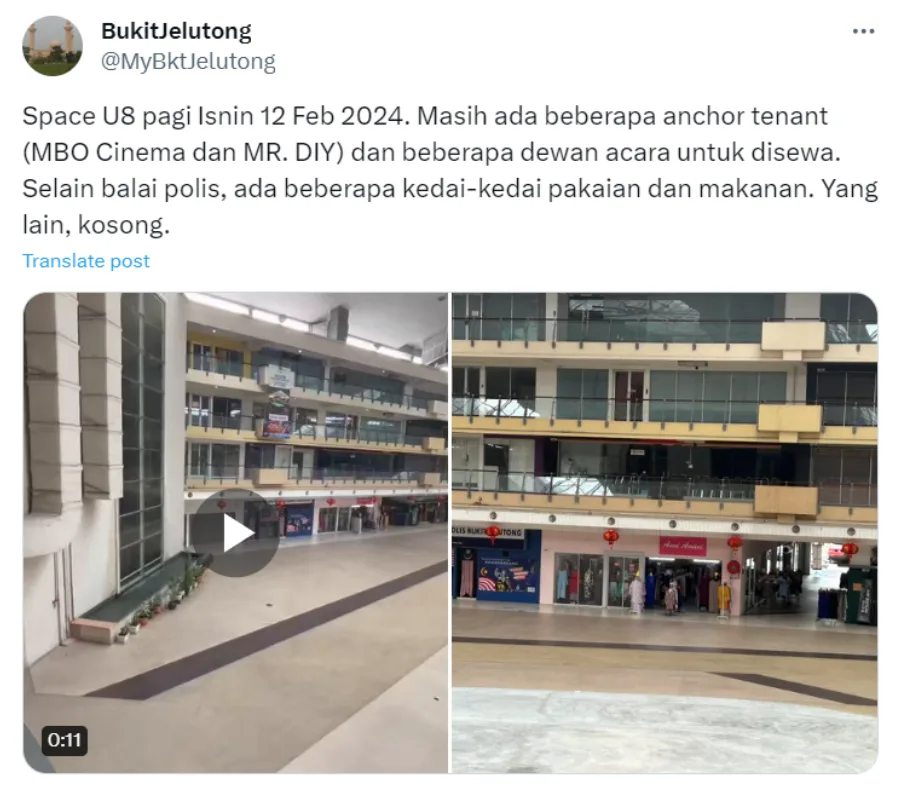 In the tweet, the account wrote, “Space U8 Monday morning 12 Feb 2024. There are still a few anchor tenants (MBO Cinema and MR. DIY) and a few event halls for rental. Besides the police station, there are a few clothing and food stores. The rest (are) empty.”