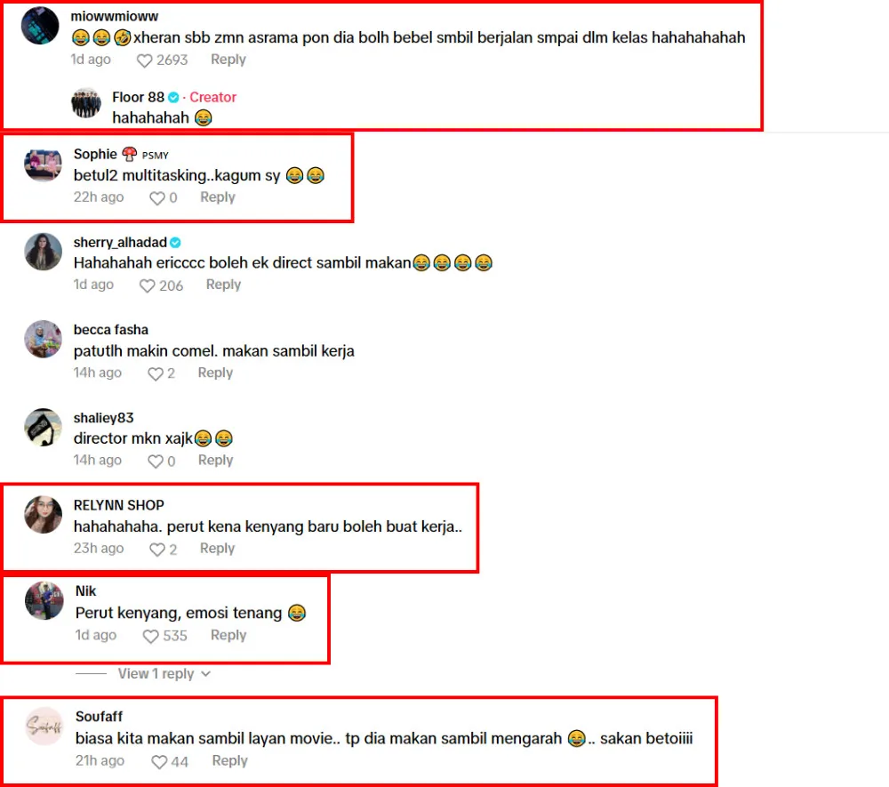 Many netizens have also reacted to the video, tickled by how the star was calmly munching away while directing. On the other hand, many joked that Eric is probably relaxed because he had food on hand while working. Some even equated the actor’s multitasking skill to one of his scenes from “Melur vs Rajawali”, where he was on a non-stop rant while walking.