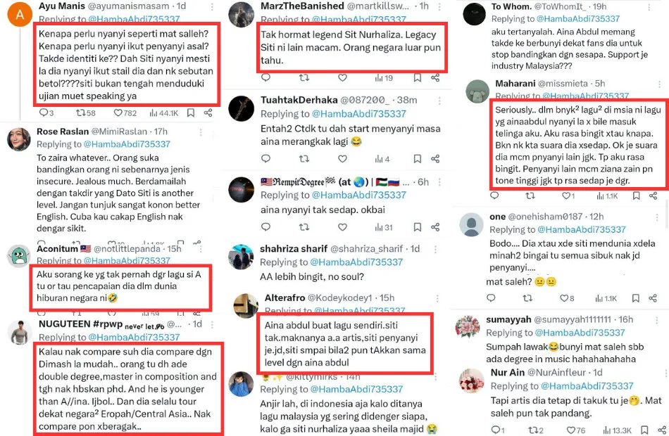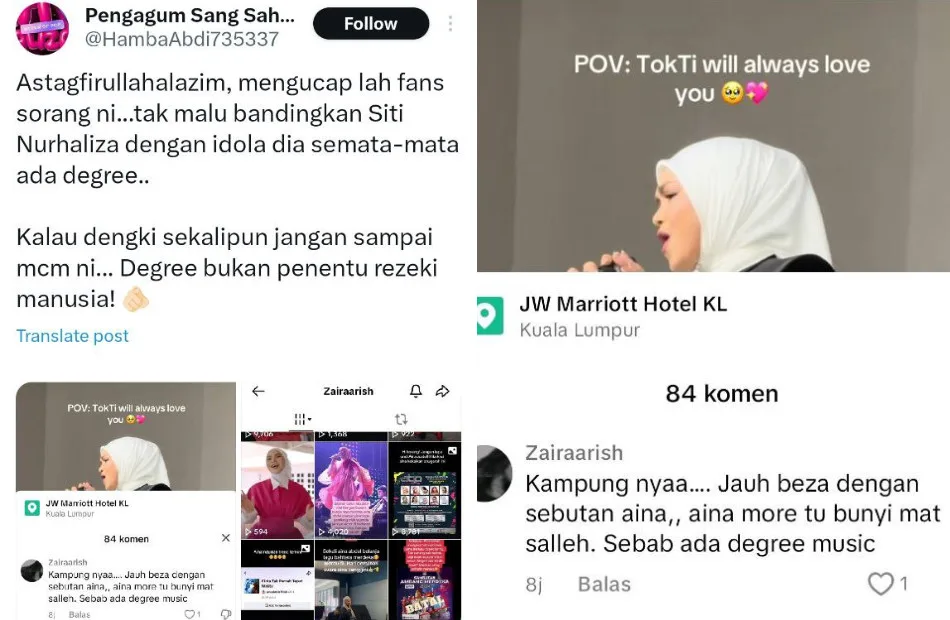 Sitizoners (Siti Nurhaliza’s fans) quickly defended their favourite singer, pointing out that the comparison was unfair since Siti is a Malay singer, not an English-language artist, and doesn’t need a Western accent in her music. Some fans expressed strong words in support of their idols, although many recognised that such interactions go against the values promoted by the artists themselves. Others emphasised Siti’s international acclaim and the respect she commands. One user argued that Aina Abdul’s songwriting abilities make her superior to Siti, who does not typically write her own music.