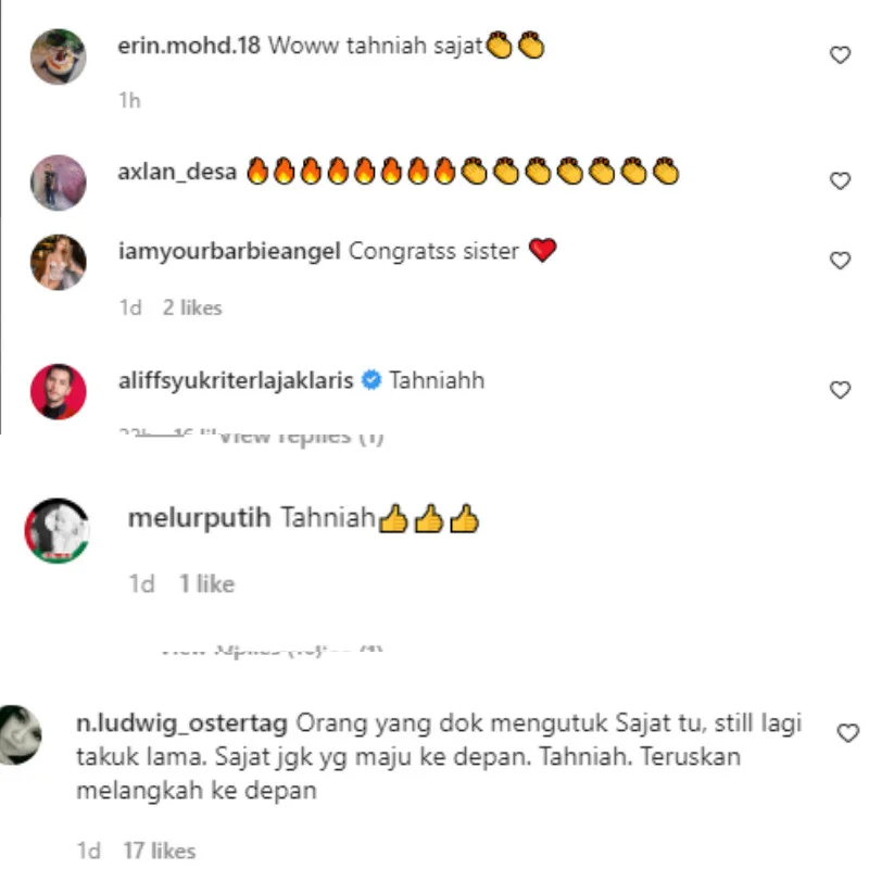 “After 6 months, NUR SAJAT LEGACY COSMETIC finally has its own assets,” she said in her caption. Comments on her posts by netizens appear to be mostly positive with everyone, including fellow entrepreneur Aliff Syukri, congratulating the Perak-born businesswoman and wishing her the best for the future.