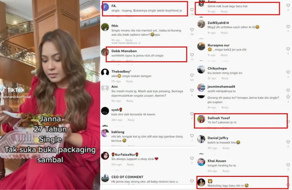 If the Instagram post wasn’t clear enough, Janna also posted a video on her TikTok of her eating with the caption that reads, “Janna Nick, 27 years old, Single, Doesn’t like to open sambal packaging”. Unlike the IG post, fans were free to comment on the TikTok video with some even speculating that the alleged breakup is just for publicity for a possible new song or TV show.