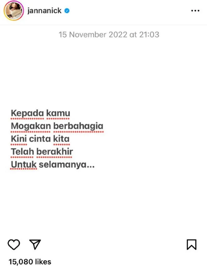 Last night (Tuesday, 15th November), actress and singer Janna Nick posted a somewhat cryptic message on her Instagram which caused concern among her fans. The “Gatal” singer posted a screenshot of what appears to be a short poem or lyrics written on a note app. The written post roughly translates to, “May you always be happy in days to come, now that our love is over and forever gone.”