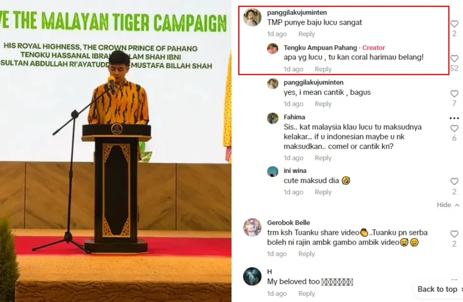 In other news, the Pahang Royal family attended the launch of the Save The Malayan Tigers Campaign which was held at Cameron Highlands yesterday (Thursday, 8th August). Tunku Azizah posted TikTok videos of her son Tengku Hassanal and her husband, Sultan Abdullah giving their respective speeches during the ceremony. One netizen commented on the video saying the Prince’s outfit was “lucu” (funny).