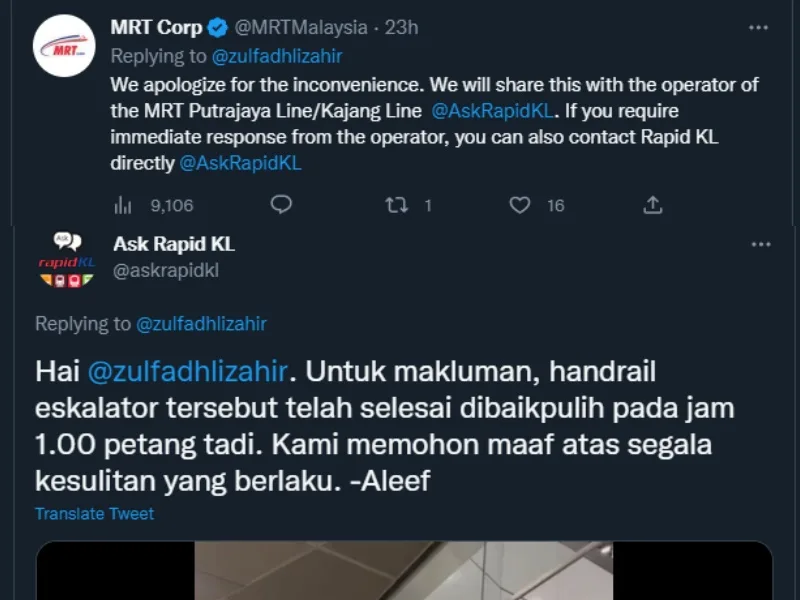 Both MRT Corporation and RapidKL became aware of the faulty handrail after the tweet went viral. Responding to the tweet, MRT Corp replied with, “We apologize for the inconvenience. We will share this with the operator of the MRT Putrajaya Line/Kajang Line @AskRapidKL”. Thankfully, RapidKL confirmed that the escalator handrail has been fixed later that afternoon and apologised for any inconvenience caused.