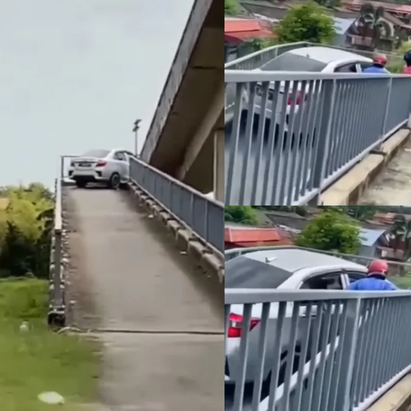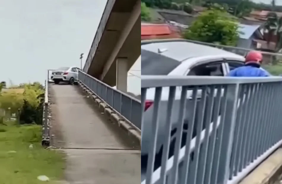 We can assume that the driver wanted to take a shortcut to go to their destination and probably thought their car was small enough to fit through the bridge. Either that or they had no idea that this was a bridge meant only for motorcyclists. After driving up the cross-over bridge, the Perodua Bezza car got stuck midway after failing to turn to the corner.