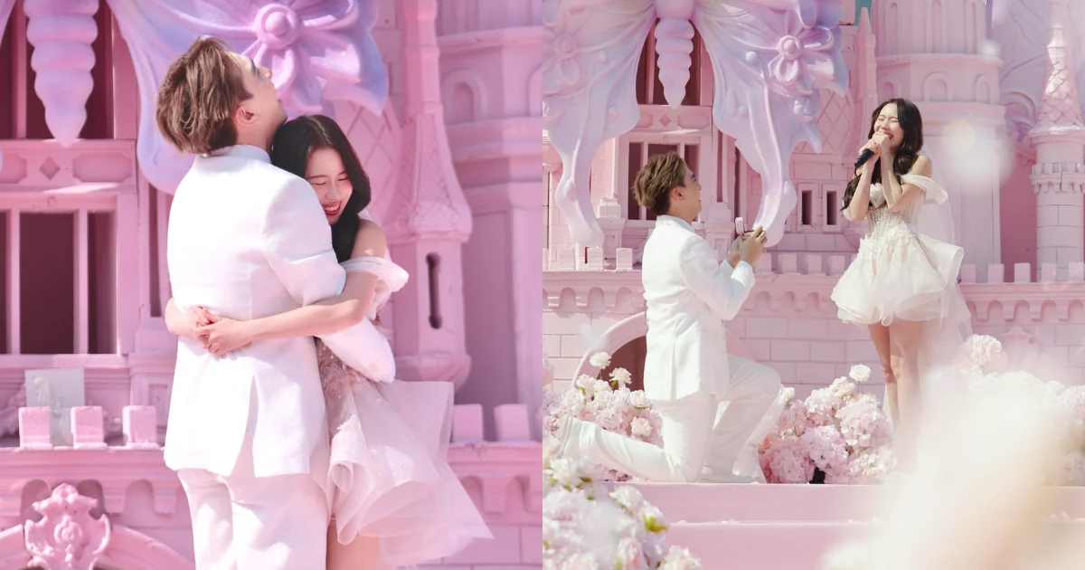 Interestingly, the proposal took place in Hangzhou, China, with everyone involved flying out from Malaysia and even Australia to help with the proposal. Perry also shared that the event took a year to plan. As shown in his video, the surprise ceremony featured a dreamy pink castle surrounded by a sea of pink flowers. As Jia Yi walked towards the castle, her family and friends greeted her and presented her with roses.