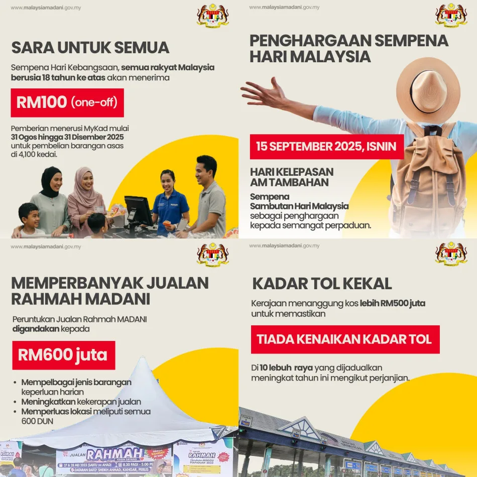 Prime Minister Anwar Ibrahim announced that every Malaysian aged 18 and above will receive a one-off RM100 cash aid via their MyKad starting from August, under the expanded Sumbangan Asas Rahmah (SARA) initiative, in conjunction with Malaysia’s Independence Day. He explained that the aid will be distributed on an individual basis, rather than by household.