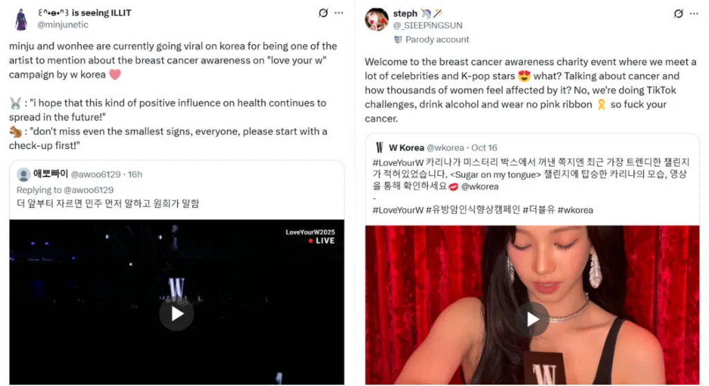 It’s also worth noting that some of the attending artists did try to bring awareness to the campaign’s issue during the night. At one point during their group’s performance, ILLIT members Minju and Wonhee spoke to the crowd, saying, “I hope that this kind of positive influence on health continues to spread in the future! Please don’t miss even the smallest of signs (of breast cancer). Everyone, please get tested.”