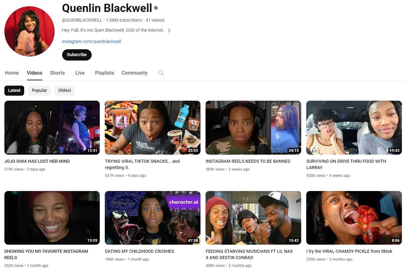 Apart from Vine, Quenlin has her own YouTube channel. She’s been posting videos regularly since 2016 and reached over 1 million subscribers. Her most frequent collaborator is influencer Larray and she’s also had singers Lil Nas and Destin Conrad on her channel.