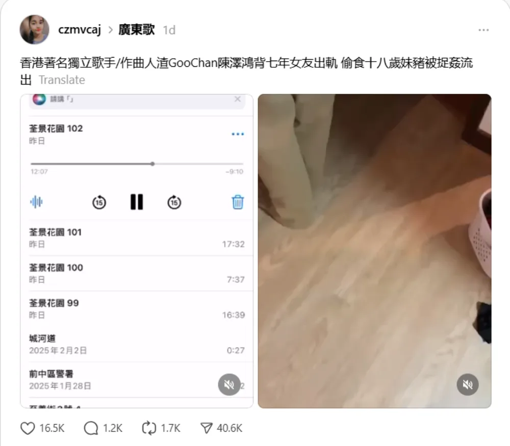 The Threads post captioned, “Famous Hong Kong indie singer-songwriter scum GooChan Chan Chak Hung cheating on his girlfriend of seven years, caught with 18-year-old,” included a voice recording and a video. Both recordings are allegedly of the moment the musician was caught cheating. In the audio, a woman, believed to be Samatha, was heard confronting a man, allegedly GooChan, after seeing him in bed with another woman.