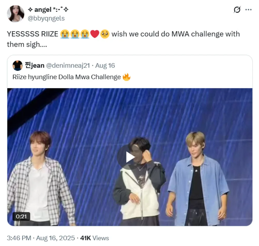 DOLLA member Angel also shared her reaction to the news, expressing joy that RIIZE did the “MWA!” dance challenge. The singer also thanked the group for the dance challenge, adding that she hoped DOLLA and RIIZE could someday meet up and dance together. Many iDOLLAs also expressed pride over the Malaysian girl group’s global reach, with some saying they hope to see more international groups doing the “MWA!” dance.