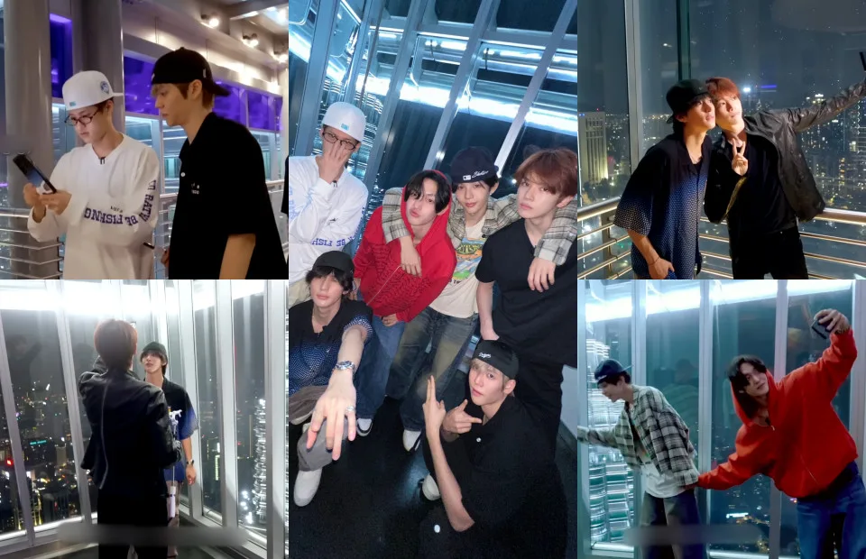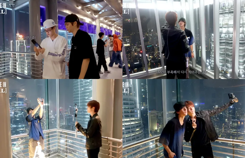 The members were in awe as soon as they saw the towers up close. On their way inside, a few fans shyly greeted Shotaro (쇼타로) and Wonbin (원빈) while respectfully keeping their distance. Once inside, RIIZE made their way up to the skybridge on the 42nd floor, walking from one end of the tower to the other. Like any excited tourists, the members wasted no time capturing photos and videos of their visit to the building, which, as it turned out, was part of their challenge. The pair who produced the most creative shots would win a prize.