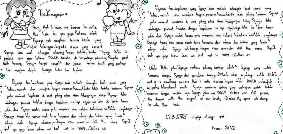 An end of something can mean a new beginning of things, a truth exemplified by former DOLLA member, Syasya Rizal when she announced her marriage upon her departure from the group. Recently, the idol posted a handwritten letter on her Instagram page, made simply to thank her fans for their relentless support as well as addressing the rising speculations made by netizens in regard to her decision.