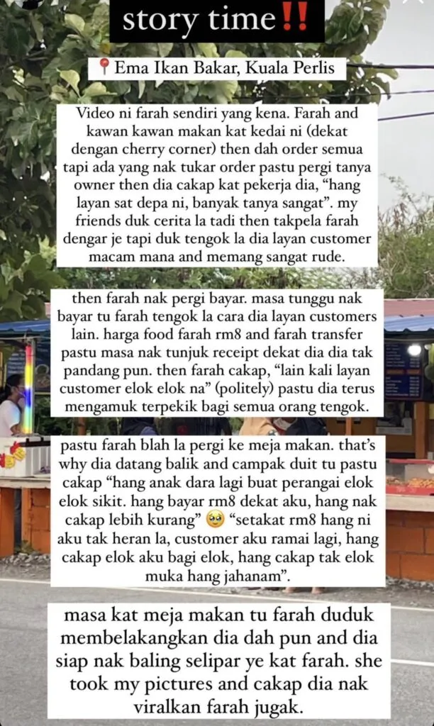 The incident allegedly started when the customer, Farah, noted the owner’s rude behaviour towards another customer who requested to change their order. Farah then politely told the owner that she should be kinder to customers, to which the stall owner took offence and started yelling at her.