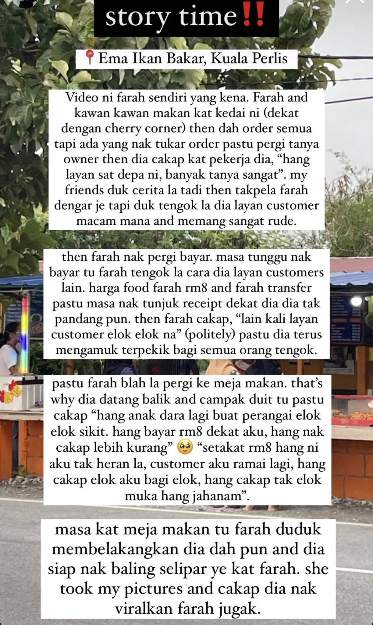 In a video shared by Twitter user @/machhiatodolce, a stall owner could be seen berating a table of customers and rudely slamming a handful of cash onto the table. According to the tweet, the incident happened at a Kuala Perlis roadside stall called Kak Ema Ikan Bakar.