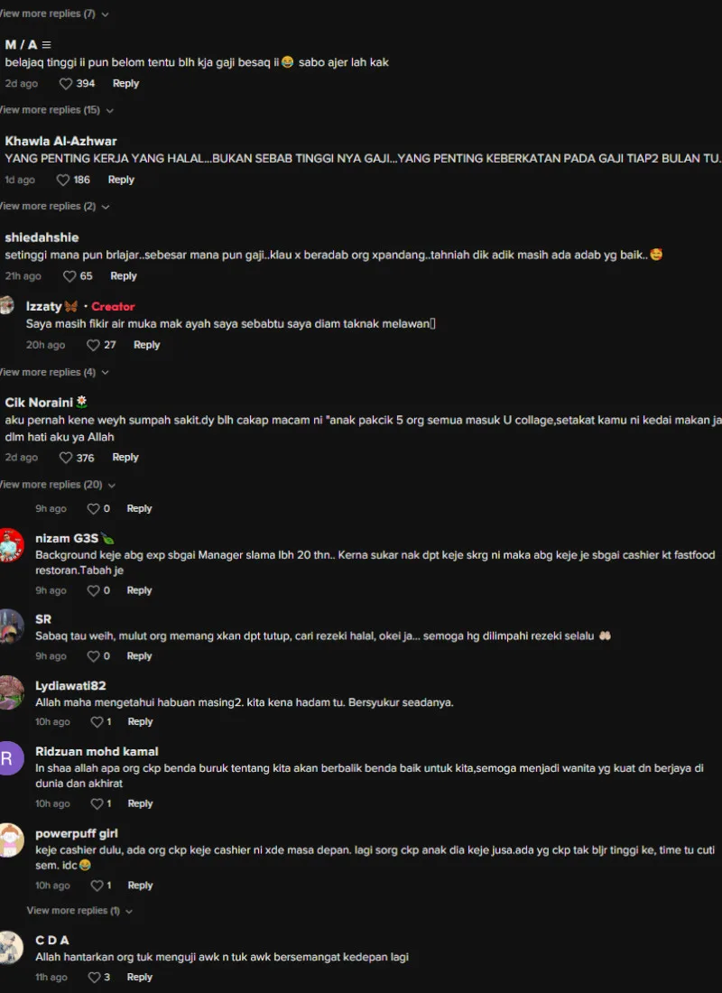 In her video uploaded on TikTok, Izzaty details her experience of being shamed by a man, only referred to as ‘pak cik’ (uncle), while working as a cashier at a petrol station. She shared that the man had visited the petrol station’s store to purchase some drinks. While at the counter, the man started a conversation with the TikToker as she rang up his items.