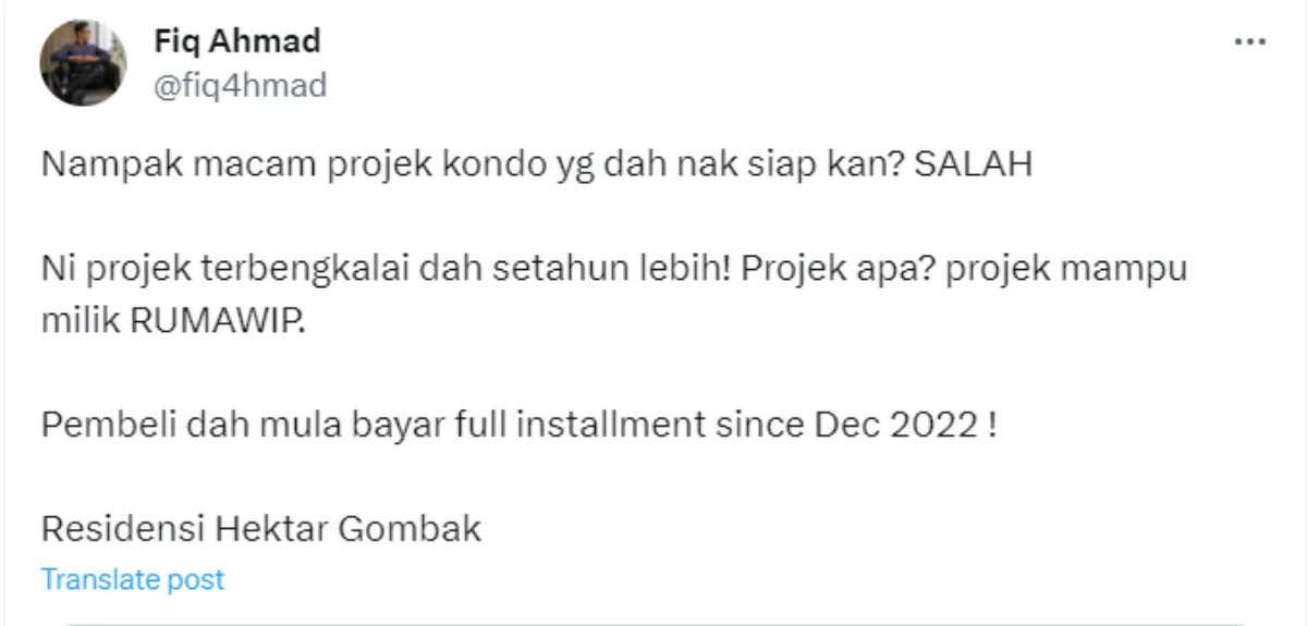 Twitter user Fiq Ahmad recently tweeted about a public housing project that has been abandoned for years, leaving the buyers frustrated. The project in question is the Residensi Hektar Gombak in Kuala Lumpur. In his tweet, Fiq revealed that the project, developed by Hektar Aneka Sdn Bhd, has yet to be completed despite buyers paying a full instalment since December 2022.