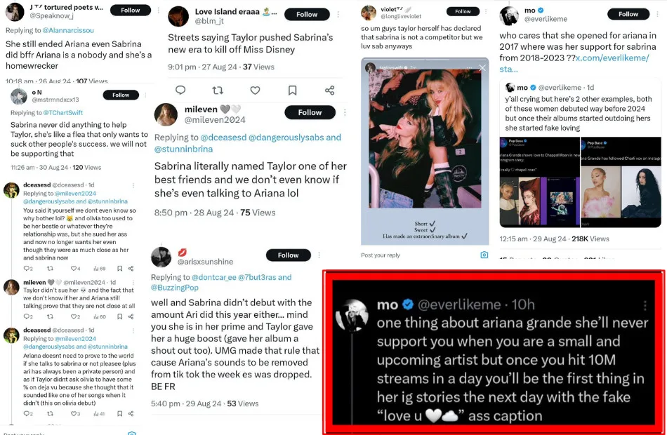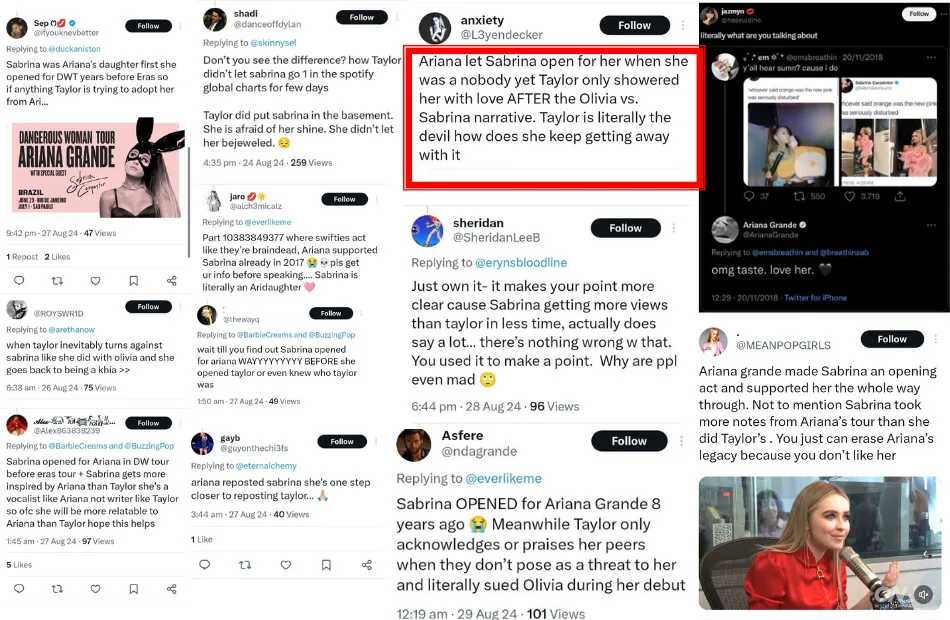 A user who is presumably a Swifty, based on her recent Twitter post writes, “One thing about Ariana Grande is she’ll never support you when you are a small and upcoming artist, but once you hit 10 million streams in a day, you’ll be the first thing in her Instagram stories the next day with the fake ‘love u’ caption.” This comment highlighted how the fan feud has escalated due to personal stories and past controversies. Ariana personal life, including her relationships and public incidents, has been dragged into the debate, with Swifties questioning her motives.