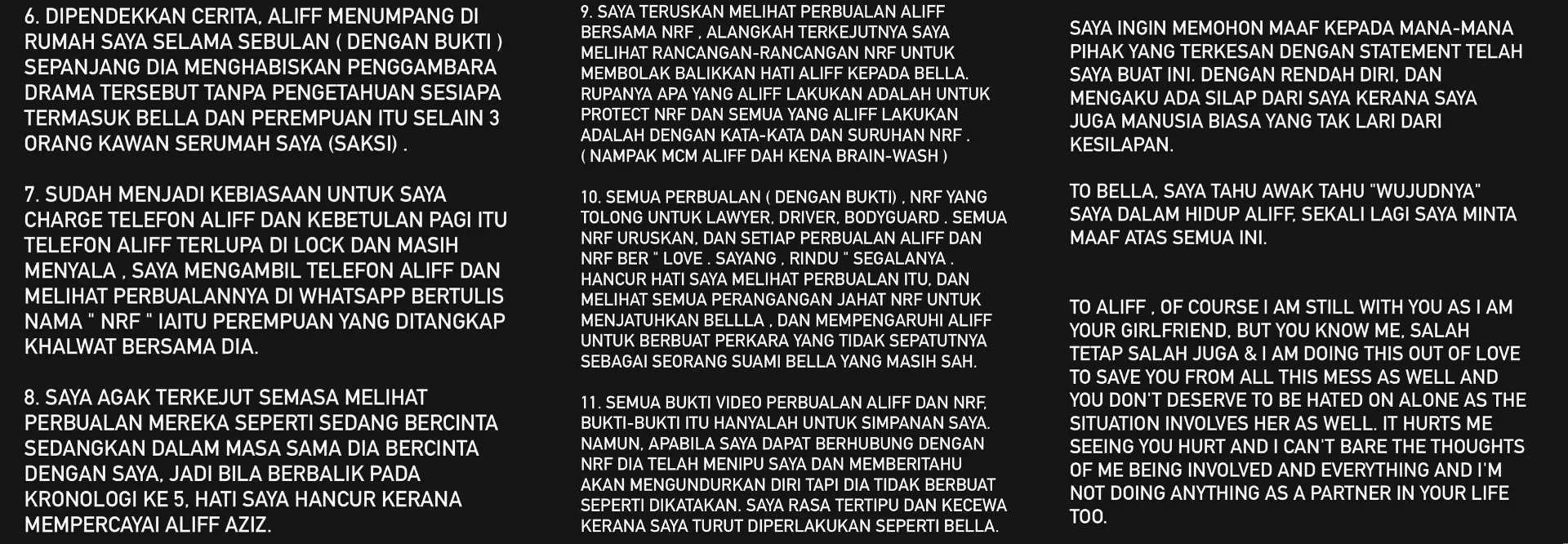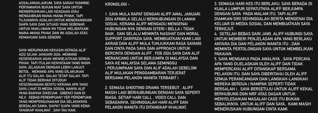 The claims made by this mysterious woman on Instagram were supported by a nine-page explanation, followed by a video of the two being physically intimate with one another including the actor kissing her cheek. According to her confessional post, Sarah stated that she had known Aliff way before she found out that the singer was having an affair with Ruhainies.