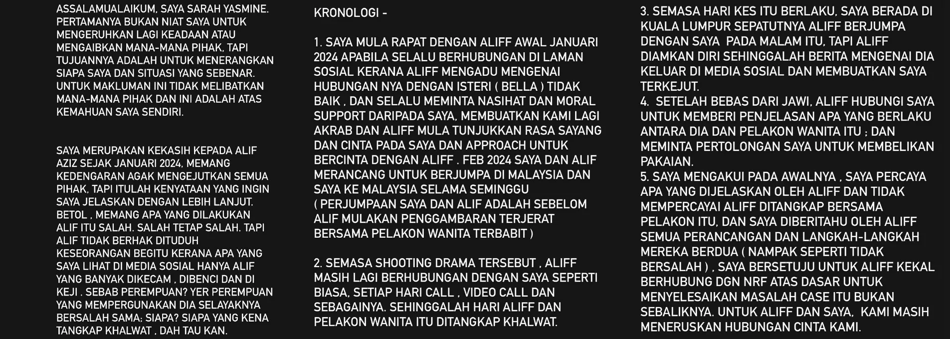 The alleged third woman was supposed to meet up with the actor on the night he was caught by JAWI but she never heard from him until she saw the news online. Upon Aliff Aziz’s release, he apparently called Sarah Yasmine and explained the entire situation. While the case between Aliff and Bella remains ongoing, the “Tentang Hati Dia” star sought shelter in the comfort of Yasmine’s home, without his wife’s knowledge nor Ruhainies herself. The only witnesses who knew of this matter were Sarah Yasmine’s housemates.