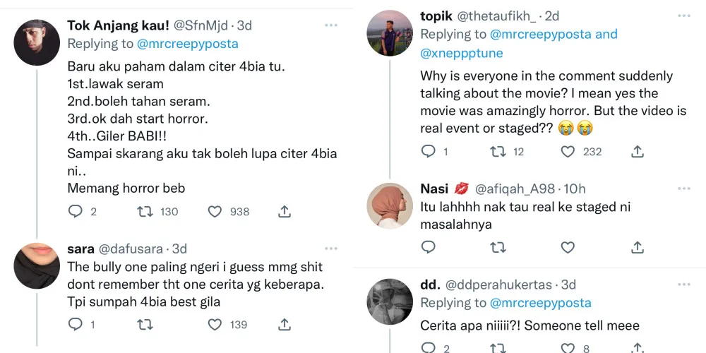 Scrolling through Twitter, many shared their stories from watching the movie “4bia”. The movie featured four different horror stories, and many said that the corpse on the plane story was especially horrifying – just like the one in the video.