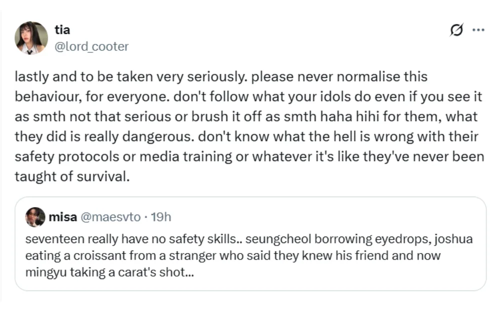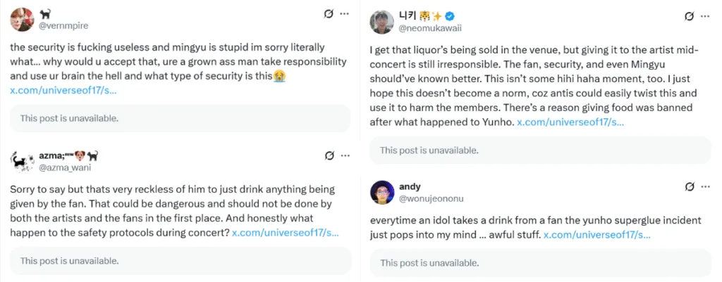 Understandably, this incident sparked massive debate, with many CARATs (SEVENTEEN fans) calling out Mingyu, the security and the fan for reckless and irresponsible behaviour. They argued that Mingyu shouldn’t willingly accept a drink, even if it’s from a fan. Some lamented that the drink could’ve been tampered with, bringing up a past incident with TVXQ! Yunho, who got poisoned by an anti-fan after accepting a drink laced with glue.