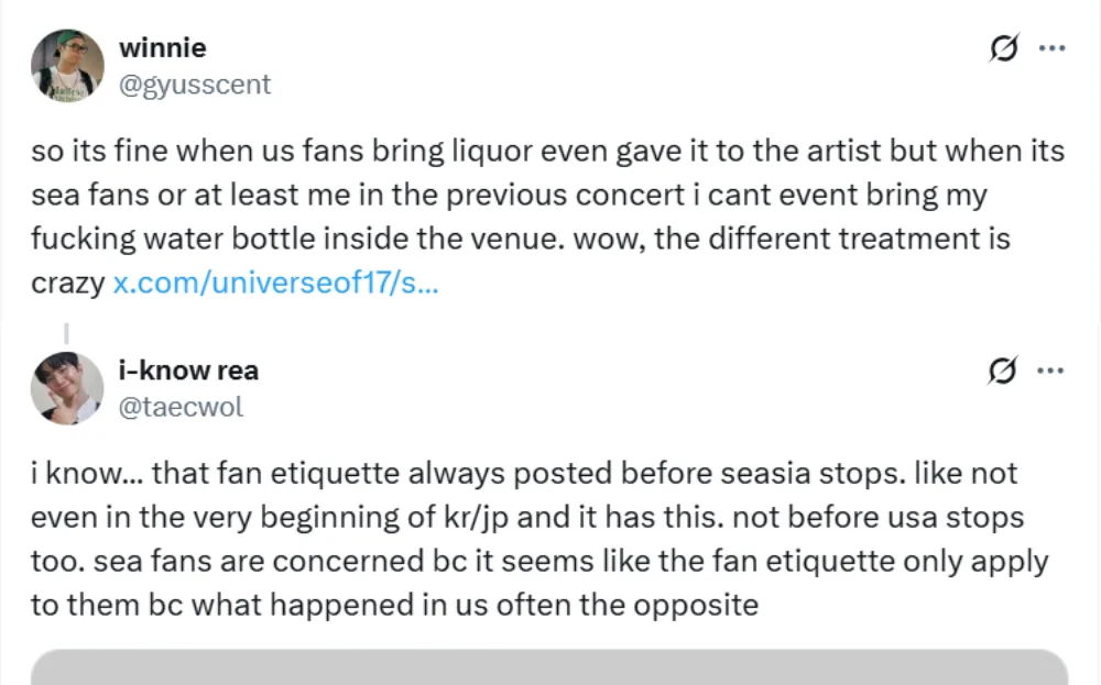The incident also sparked arguments about K-pop idols’ blatant favouritism towards North American fans. Many argue that the fan would’ve gotten more backlash if the incident had happened in Asia. Some also pointed out that idols and fans often disregard fan etiquette when K-pop groups perform in Western countries, with some interactions lauded as entertaining. Meanwhile, the same etiquettes are heavily reinforced in Southeast Asia, citing safety concerns.