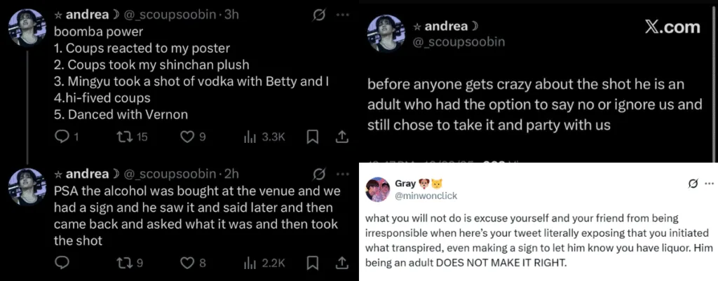On 21st October 2025 (Tuesday), SEVENTEEN performed at the Moody Centre in Austin, Texas as part of their “NEW_” World Tour. During the encore stage, Mingyu spotted a fan offering shots of alcohol. As shown in now-viral videos, the idol gestured to the fan to pass him the vodka shot via a security personnel. He then proceeded to consume the drink. It’s worth noting that alcohol is sold on the premises and allowed into the concert hall.
