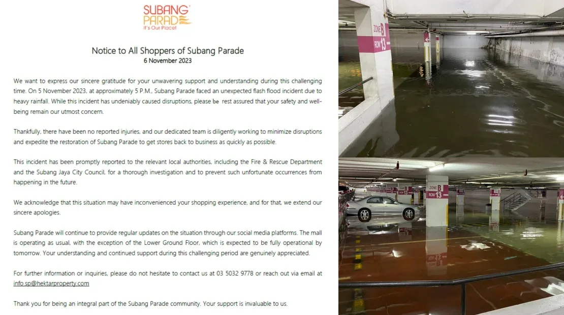 It was then reported that the entire mall had been flooded by the heavy storm outside. Photos were posted of the affected areas with one showing that the lowest level of the basement parking lot was almost completely submerged in water. Subang Parade posted a statement the following day to address the situation.