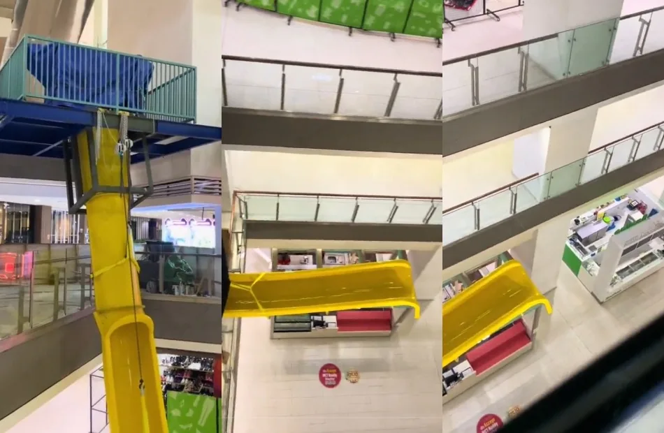 At first glance, the slide appeared normal, but as the video progressed, the user revealed that it extended only halfway down, not even reaching the ground floor. Clearly, the slide is still under construction, but its half-finished state added a humorous touch, making it seem as though mall visitors would fall from the slide directly in front of the Llaollao stall on the ground floor.
