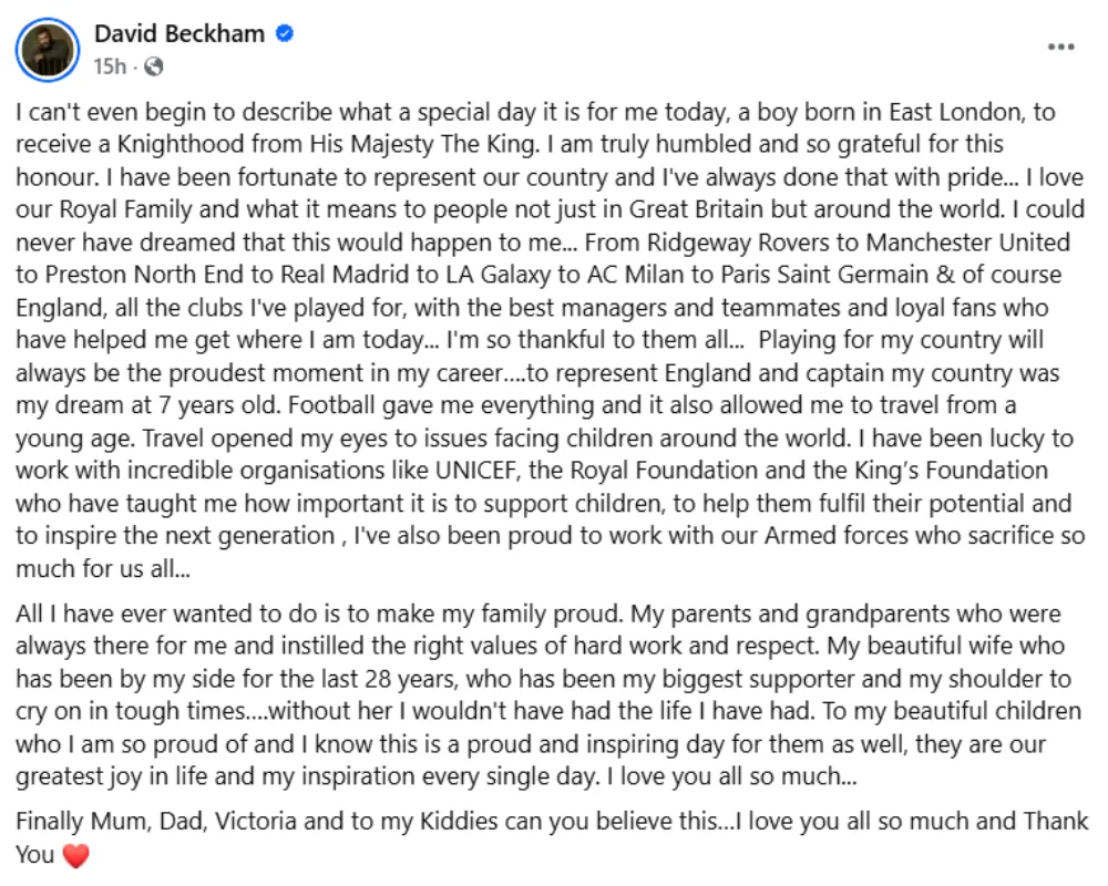 In his post, David wrote, “I can’t even begin to describe what a special day it is for me today, a boy born in East London, to receive a Knighthood from His Majesty The King. I am truly humbled and so grateful for this honour.” He added, “I have been fortunate to represent our country, and I’ve always done that with pride. I love our Royal Family and what it means to people, not just in Great Britain but around the world. I could never have dreamed that this would happen to me.”