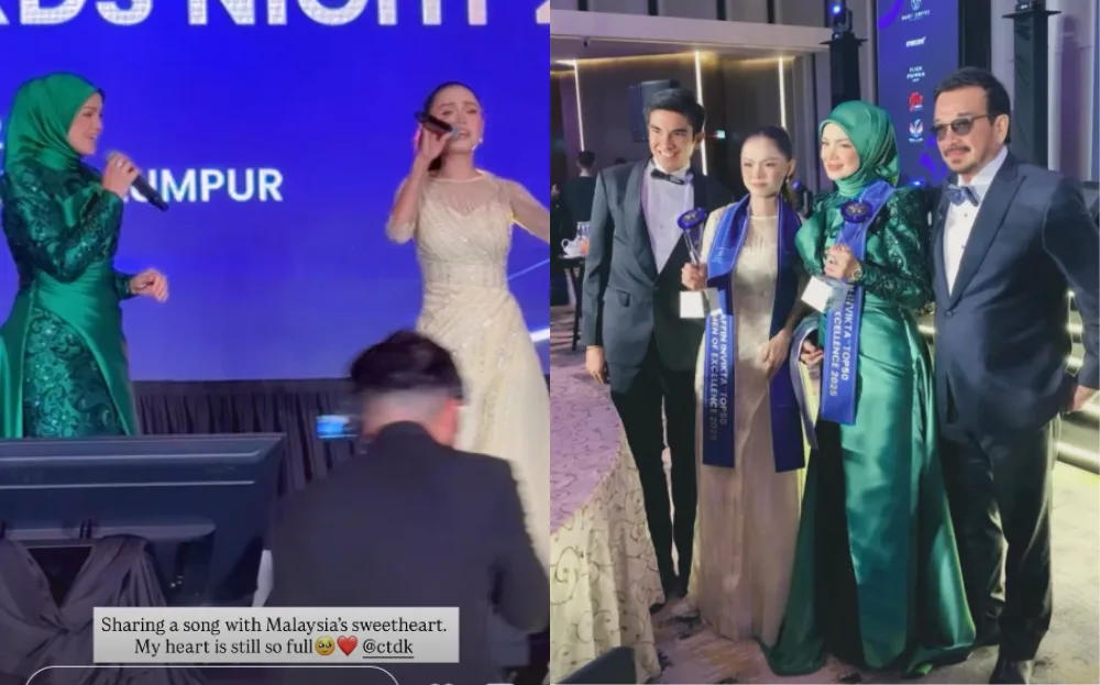 During the event, the singer also performed with actress-singer Bella Astillah, singing one of Siti Nurhaliza’s hit songs, “Bukan Cinta Biasa”. According to news reports, the performance was an impromptu request from the organiser. Through an Instagram Stories post, Bella gushed about performing with the Malaysian icon, saying, “Sharing a song with Malaysia’s sweetheart. My heart is still so full.”