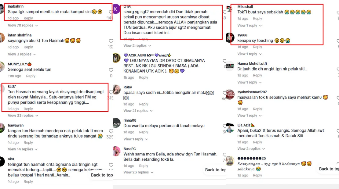 Shortly after the video was posted, many were moved by the emotional moments shared by the two public figures, both offstage and onstage. Some remarked on the humility of the two icons, while others highlighted the deep respect and affection the public holds for Tun Hasmah.