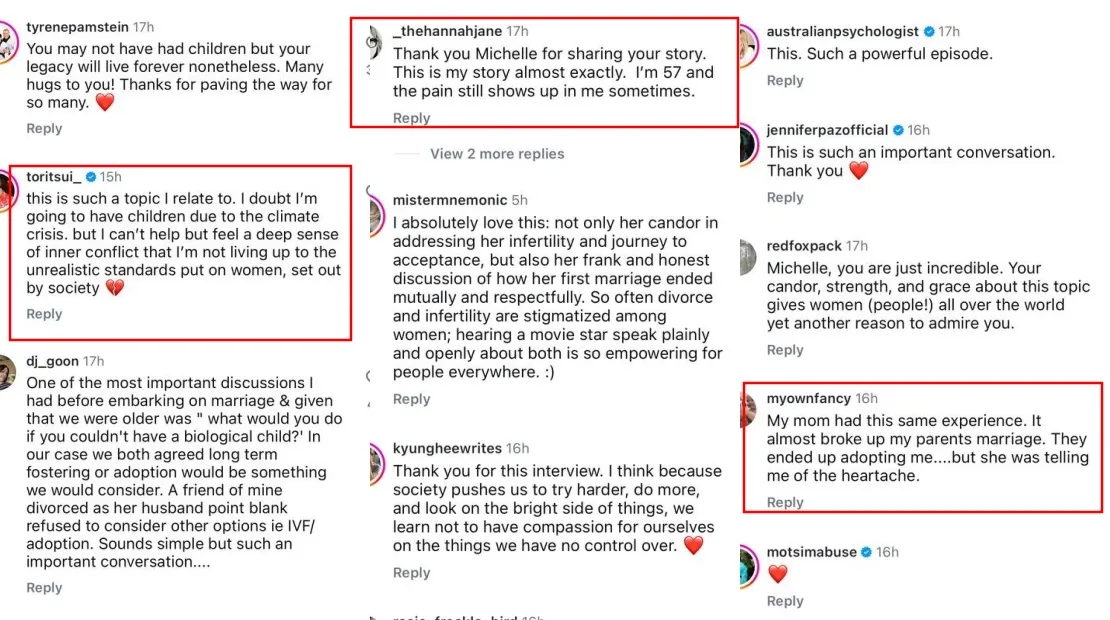 Michelle reiterated her previous statement on the matter, confirming that the divorce was a mutual decision, as she and her ex-husband Dickson believed it would be for the best. After the interview snippet was posted on Instagram, fans (particularly mothers) resonated with the Malaysian-born star’s story. Many thanked her for candidly discussing her infertility, a topic that is often considered taboo. Others shared their own struggles with having children and the steps they’ve taken to move forward.