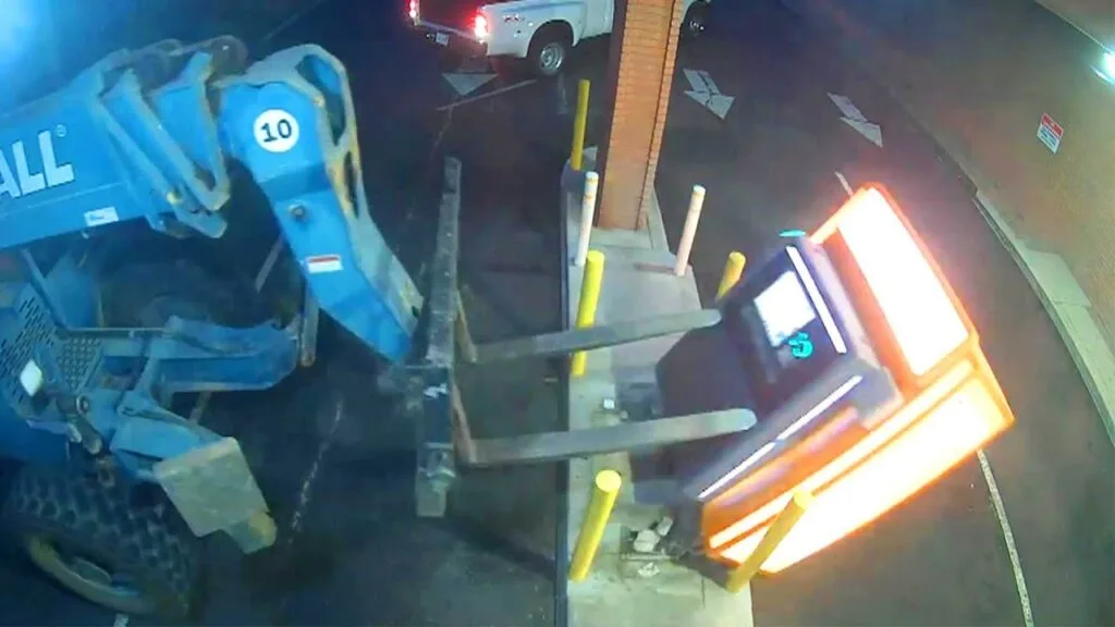 The two suspects wasted no time, with the forklift driver quickly ramming the ATM and dislodging the machine from the raised platform. As the forklift operator was getting ready to toss the ATM into the bed of the pickup truck, another car passed by – the occupants witnessed the robbery, before immediately driving away.