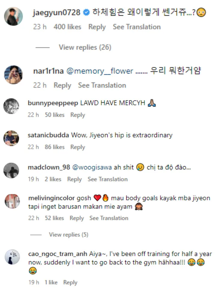 But that wasn’t the only thing that caught netizens’ eyes because the 29-year-old’s form-fitting workout bottoms showed off her toned and curvaceous body. Even her husband, former baseball player Hwang Jae Gyun (황재균), had to share his amazement by commenting, “Why is your lower body strength this strong?”.