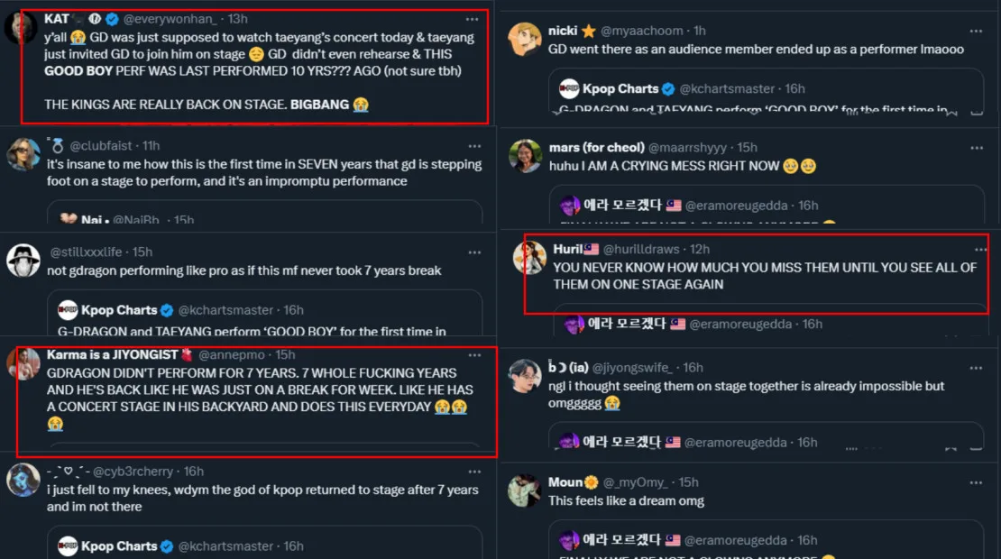 Fans took to social media to express their excitement of seeing BIGBANG together onstage again. Since it was a last-minute decision, many were incredibly impressed that G-Dragon remembered each step of the “Good Boy” choreography despite not performing it for nearly a decade. Hopefully, we’ll get to see another reunion when G-Dragon goes on his solo tour soon.