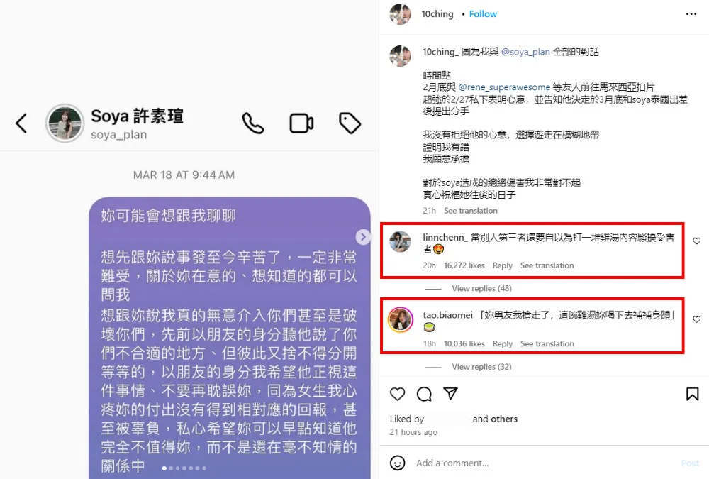Shortly after the video, the “short-haired woman” took to Instagram to reveal her side of the story on social media. The individual, a Taiwanese public figure named Shi Ching (石靜), shared her conversation with Soya, where she admitted to having an affair with René. While she apologised to Soya, netizens slammed her for the post, saying her words were disingenuous. Many also said that Shi Ching doesn’t seem to take the blame for breaking up a couple. Similarly, René has also received a lot of flak from netizens for his apology video.