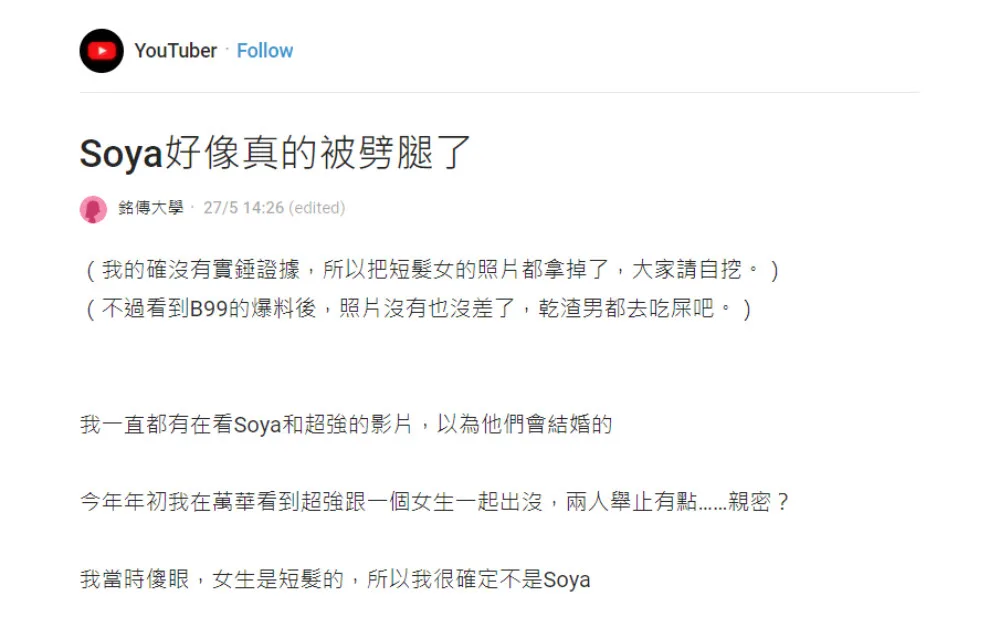 Back in April, Malaysian YouTuber Soya (許素瑄), a.k.a Soya’s Plan (手癢計劃), shocked fans when she announced her split from her Taiwanese YouTuber boyfriend, René (超強) after four years of dating. However, after much speculation about their split, René admitted that the reason behind the breakup was because of his infidelity.