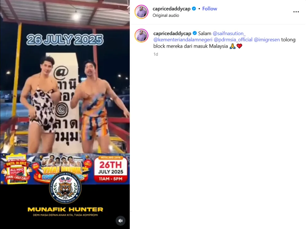 In his post about the event, Caprice tagged local authorities and the Immigration department, urging them to block the Thai Hot Guys from entering Malaysia and attending the event. The comments also argued that the event is disrespectful to the local culture, given the controversial content the Thai Hot Guys are known for. Others also questioned how MPO had received approval to hold the event.