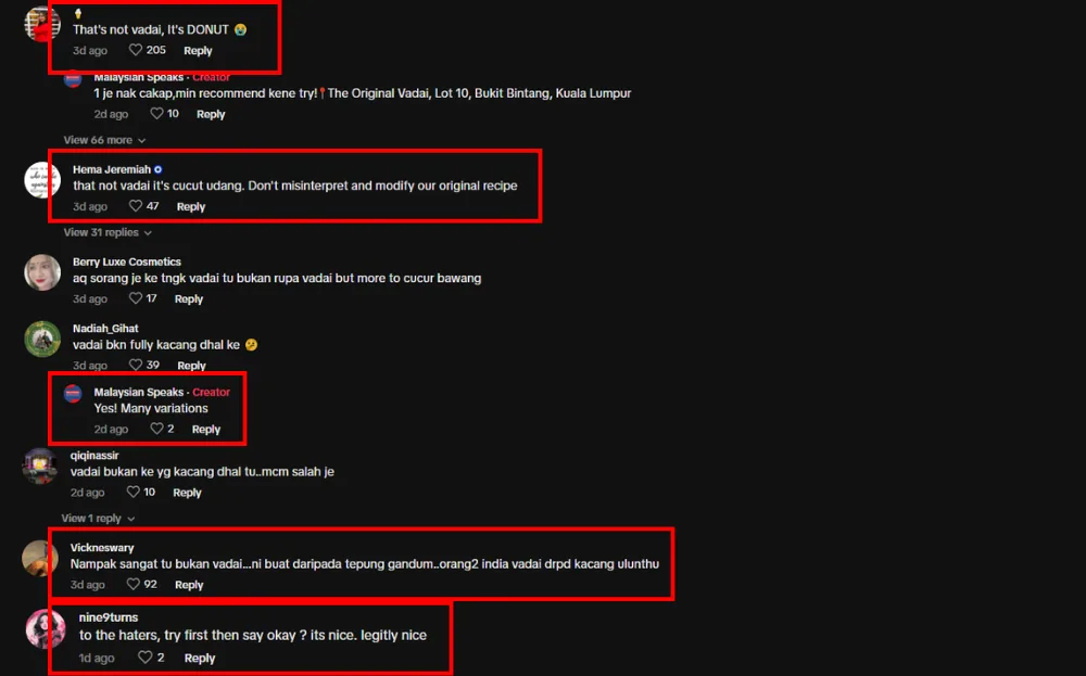 According to many Malaysians, the vadai from the store looked more like cucur udang, or prawn fritters, because of the texture. One comment even said the vadais are more similar to doughnuts, while another said the snack needs to have a specific type of dhal to be considered a vadai. It is worth noting that the typical vadai sold in Malaysia has a chunkier texture because of the legumes used for the batter.