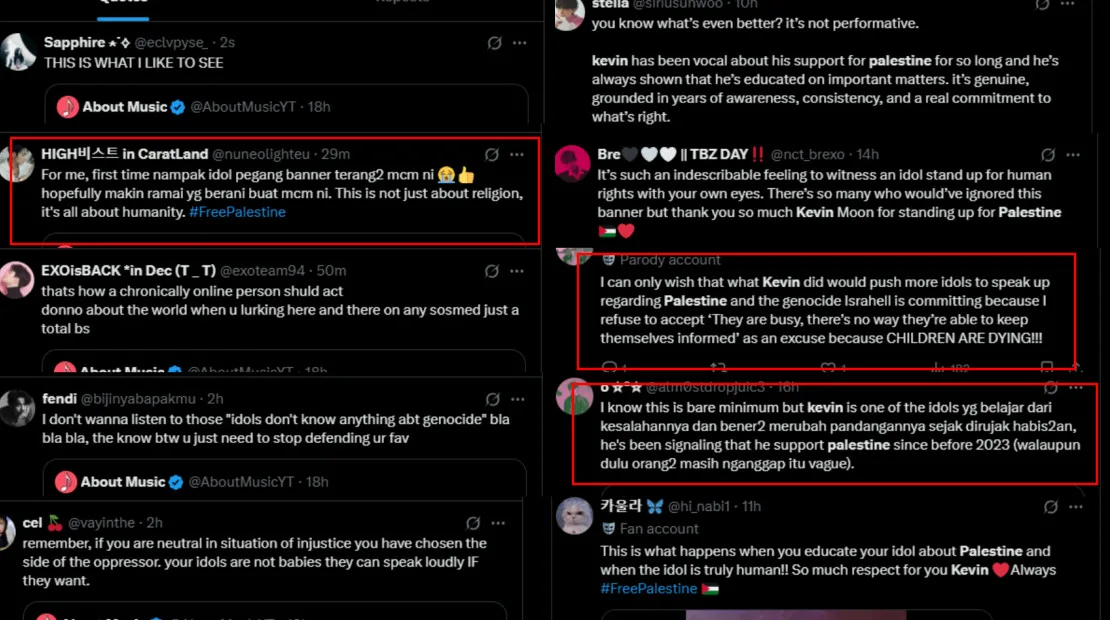 Others remarked that, although his actions could be seen as the bare minimum, they still commended him for proudly displaying the Palestinian flag and making his political stance on the matter clear. Fans also urged other K-pop idols to follow Kevin’s example by using their platforms and influence to educate and raise awareness among their own fanbases.