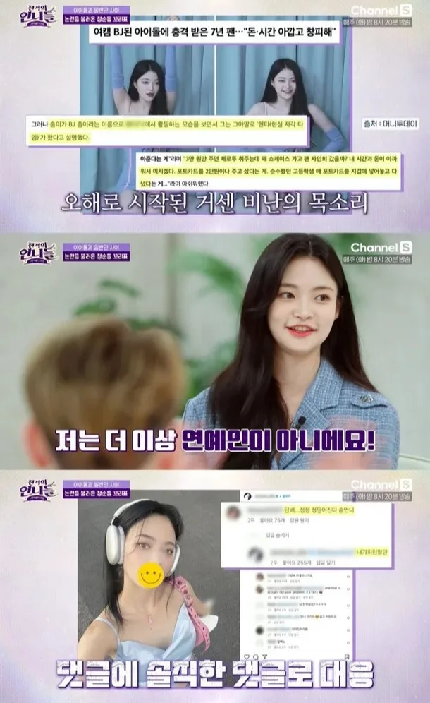 “I’ve been working as a BJ (broadcasting jockey) for a year now. I’ve received a lot of criticisms as I used to be an idol. After my group disbanded, I finished my exclusive contract, and chose BJ as my new job, but I’m suffering from criticism and malicious comments because it’s a platform with many adult-oriented content,” Somyi told the MCs.